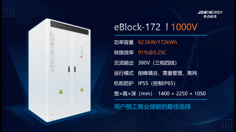 這款產品是我們的eBlock-172。功率容量為62.5kW/172kWh,轉化效率為91%,它適用于用戶側工商業(yè)應用場景。