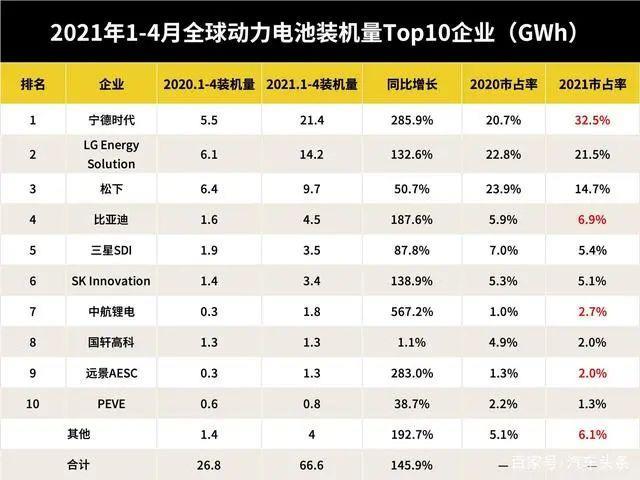 根據(jù)SNE Research發(fā)布的今年1-4月全球動力電池裝機量數(shù)據(jù),全球動力電池在電動汽車上的裝機量從去年同期的26.8GWh上升至 65.9 GWh,同比增長145.9%。