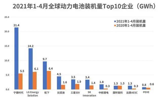 以寧德時代為例,利用產(chǎn)業(yè)鏈優(yōu)勢及特斯拉、蔚來等“大批量”的合作網(wǎng)絡(luò),作為龍頭企業(yè)的寧德時代從去年年底便形成了對LG Energy Solution和松下等反超。今年前四個月來看,這樣的領(lǐng)先優(yōu)勢仍不斷擴大。