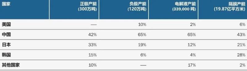 表2:全球主要鋰電生產(chǎn)國家的主材產(chǎn)能。