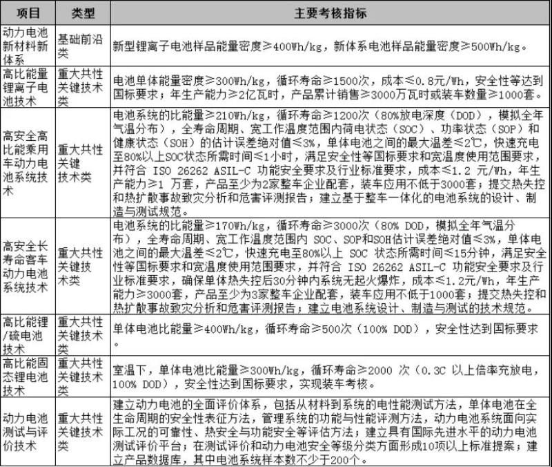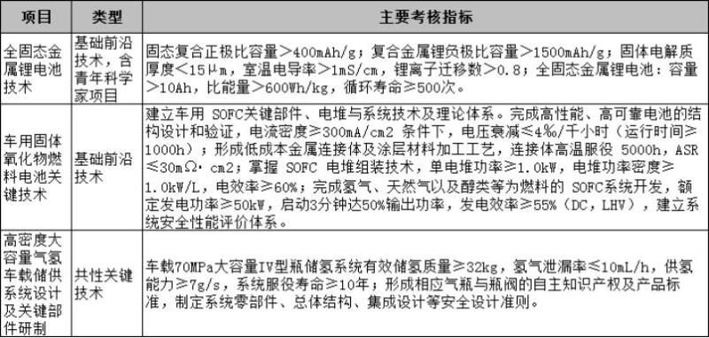 其中,在能源動(dòng)力方面,將重點(diǎn)圍繞全固態(tài)金屬鋰電池技術(shù)、車(chē)用固體氧化物燃料電池關(guān)鍵技術(shù)、高密度大容量氣氫車(chē)載儲(chǔ)供系統(tǒng)設(shè)計(jì)及關(guān)鍵部件研制作出支持。主要考核指標(biāo)如下: