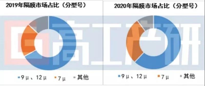 從產(chǎn)品型號(hào)來(lái)看,2020年受動(dòng)力能量密度提升、三元?jiǎng)恿σ约扳捤徜嚁?shù)碼電池出貨量增長(zhǎng)帶動(dòng),國(guó)內(nèi)鋰電池隔膜向薄層化以及功能化方向發(fā)展加快。2020年細(xì)分產(chǎn)品型號(hào)主要集中在7/9/12μm領(lǐng)域,其中5μm濕法隔膜正在加快市場(chǎng)導(dǎo)入,這將對(duì)隔膜企業(yè)在產(chǎn)品質(zhì)量和技術(shù)方面提出更高的要求。