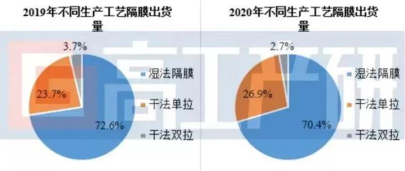 值得注意的是,盡管濕法隔膜占比更高,但干法隔膜的出貨量卻快速提升,2020年出貨增速大于濕法。