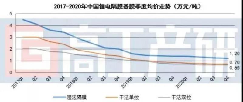 其中,2020年國(guó)內(nèi)隔膜價(jià)格繼續(xù)下行,但降幅收窄,價(jià)格走勢(shì)全年呈現(xiàn)上半年顯著下降,下半年基本穩(wěn)定態(tài)勢(shì)。主要原因有: