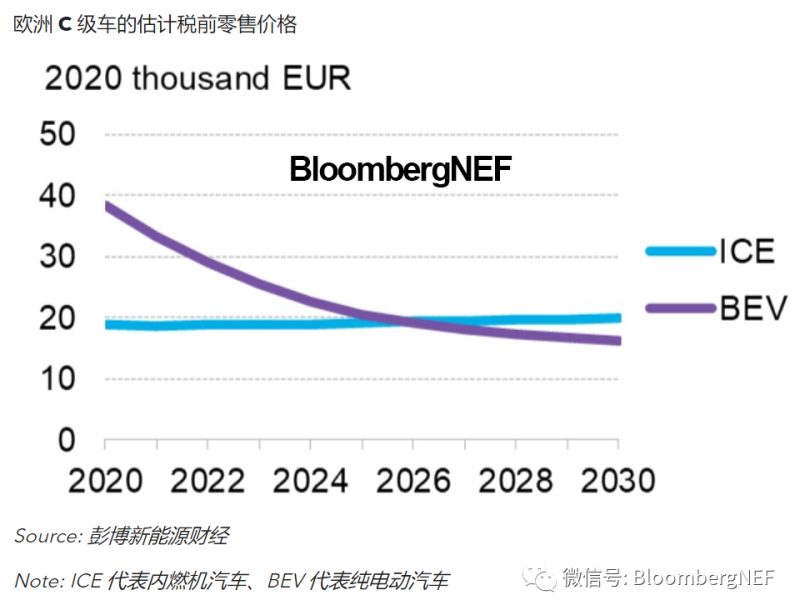 在歐洲所有輕型汽車細分市場中純電動汽車與內(nèi)燃機汽車達到平價的年份