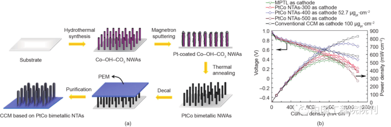 圖15(a)基于鉑鈷納米管陣列制造膜電極的示意圖。(b)基于鉑鈷納米管陰極的膜電極的性能比較,鉑鈷納米管在300 ℃、400 ℃和500 ℃進(jìn)行退火處理。測試條件:Nafion 212膜;膜電極有效面積為2.56 cm2 ;電池溫度為80 ℃;H2/O2,相對濕度為80%,背壓為0.2 MPa。轉(zhuǎn)載自參考文獻(xiàn),經(jīng)Elsevier Ltd.許可,©2017