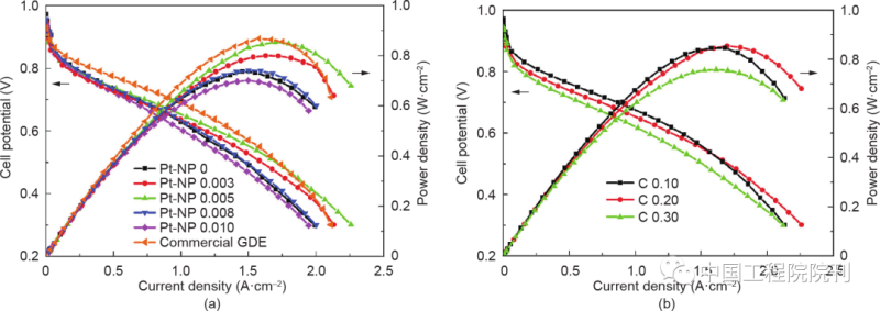 圖14 MEA的極化曲線和功率密度曲線,其中陰極由Pt/C納米顆粒氣體擴(kuò)散電極或鉑納米線陣列電極制成,用于后者生長的碳粉襯底層中Pt/C 的含量為0~0.010 mg?cm–2(a),碳負(fù)載量為0.10 mg·cm–2、0.20 mg·cm–2或0.30 mg·cm–2(b),所有電極催化層中的鉑納米線負(fù)載量均為0.20 mg?cm–2。碳粉襯底層中的碳和Pt/C的負(fù)載量分別為20 μg?cm–2(a)和5 μg?cm–2(b)。測試條件:Nafion 212膜;膜電極有效面積為10 cm2 ;電池溫度為70 ℃;化學(xué)計量比為1.5/2.0的H2/空氣,65 ℃下加濕,背壓為0.1 MPa。經(jīng)Hydrogen Energy Publications LLC許可,轉(zhuǎn)載自參考文獻(xiàn),©2018