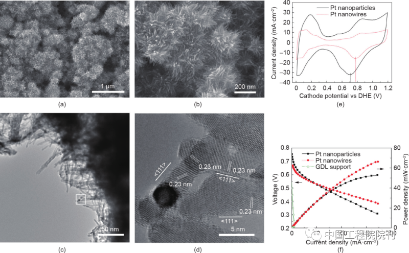 圖13 原位生長在活性屏等離子氮化處理的GDL表面上的鉑納米線。(a、b)GDL表面的鉑納米線陣列的SEM圖像。(c)從鉑納米線陣列氣體擴(kuò)散電極上刮取的鉑納米線的TEM圖像。(d)為(c)中白方塊所示區(qū)域的HR-TEM圖像,顯示了沿<111>晶體方向生長的單晶鉑納米線。(e)陰極循環(huán)伏安曲線。(f)膜電極在直接甲醇燃料電池中的極化曲線:膜電極的陰極分別為鉑納米線陣列電極(2 mg?cm–2)、Pt/C納米顆粒電極(JM的直接甲醇燃料電池陰極,4 mg?cm–2)和等離子處理的GDL。測試條件:膜電極面積為5 cm2 ;Nafion 117膜;電池溫度為75 ℃;JM陽極(4 mg?cm–2)。CV測試時陰極為1 mL?min–1的超純水,陽極為未加濕的氫[流速為每分鐘100標(biāo)準(zhǔn)立方厘米(sccm)]。極化曲線測試時陽極為 1 mol?L–1甲醇(流速為1 mL?min–1),陰極為無加濕空氣(流速為100 sccm)。DHE:動態(tài)氫電極。經(jīng)Springer Nature Limited許可,轉(zhuǎn)載自參考文獻(xiàn),©2014