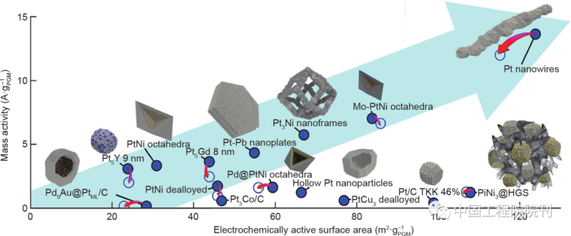 圖8 各種報道的燃料電池催化劑的ORR質(zhì)量活性比較(基于液體電解質(zhì)中半電池電化學(xué)測試的報道值)。填充的和空心的藍(lán)色圓圈顯示了加速老化試驗前后的質(zhì)量活性和ECSA。HGS:空心石墨球。經(jīng)Elsevier B.V.許可,轉(zhuǎn)載自參考文獻(xiàn),©2018