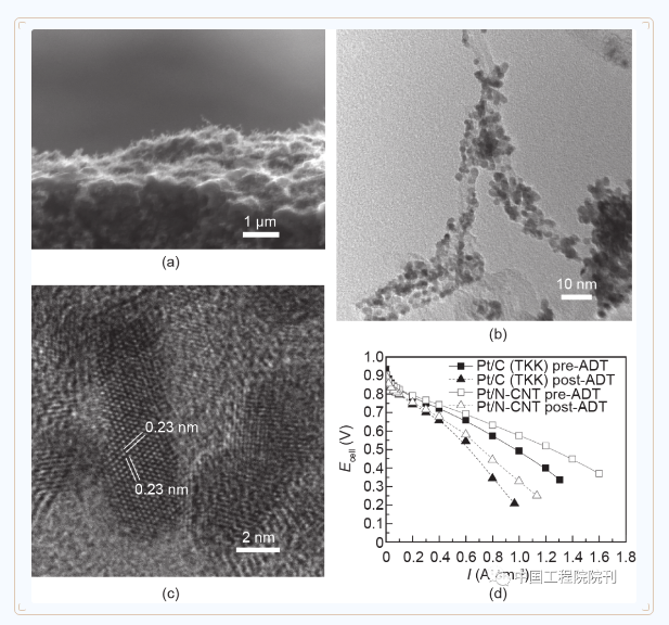 圖7(a)沉積了N-CNT陣列的GDL的橫截面的SEM圖像;(b)用鉑納米棒修飾的N-CNT的TEM圖像;(c)顯示沿<111>晶體方向生長的單晶鉑納米棒晶格間距的HRTEM圖像;(d)加速老化試驗(ADT)前后Pt/C納米顆粒和Pt/N-CNT陣列電極的極化曲線。測試條件:Nafion 212膜;MEA活性面積為16 cm2 ;陽極為JM公司的Pt/C氣體擴(kuò)散電極(GDE);電池溫度為80 ℃,100%相對濕度的H2/空氣,化學(xué)計量比為1.3∶1.5,背壓為0.05 MPa;ADT:在0.6 V和1.2 V之間進(jìn)行3000次電位掃描循環(huán),掃描速率為100 mV?s–1,陰極為N2。經(jīng)Elsevier B.V.許可,轉(zhuǎn)載自參考文獻(xiàn),©2020