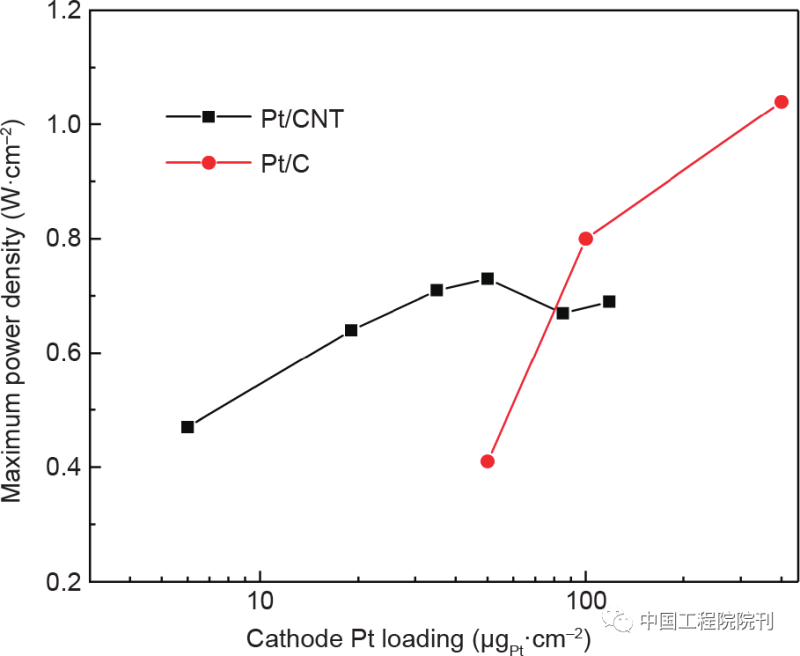 圖6 單電池測試中采用Pt/CNT和Pt/C陰極的膜電極的功率密度隨催化劑負(fù)載量變化的比較。MEA測試條件:Nafion 212膜;MEA活性面積為2 cm × 2 cm;陽極:0.4 mg?cm–2 [JM Pt/C, 40%(質(zhì)量分?jǐn)?shù))Pt];測試溫度為80 ℃;H2/O2,背壓為0.2 MPa。數(shù)據(jù)來自參考文獻(xiàn)