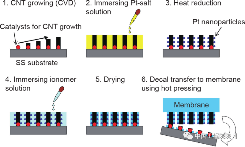 Pt納米顆粒修飾的CNT陣列電極的典型制備流程如圖5所示。一般來先是利用催化劑(如Fe或 FeCo)在襯底表面(如不銹鋼、SiO2、石英、鋁箔等)生長CNT陣列,然后通過化學(xué)或物理方法在整個 CNT或頂部沉積鉑納米顆粒,并在表面涂覆離子聚合物,最后利用熱壓的方法將帶有Pt納米顆粒的CNT陣列轉(zhuǎn)移到PEM上。
