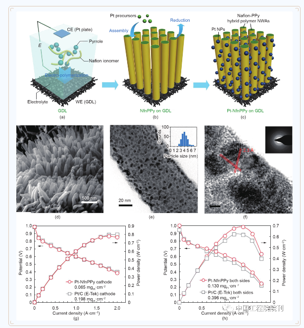 圖4(a~c)PPy NWA電極的制備流程圖:(a)電化學(xué)聚合法生長PPy納米線;(b)負(fù)載Pt催化劑;(c)制備MEA。Pt-NfnPPy納米線的掃描電子顯微鏡(SEM)圖像(d)和透射電子顯微鏡(TEM)圖像(e),(e)中的插圖顯示了鉑納米顆粒的尺寸分布;(f)為Pt-NfnPPy的高分辨率透射電子顯微鏡(HRTEM)圖像,插圖為選區(qū)電子衍射(SAED)圖案;(g、h)在70 ℃和100%相對濕度下在H2/O2(g)和H2/空氣(h)中測得的以Pt-NfnPPy和常規(guī)Pt/C為電極材料的膜電極的極化曲線(Nafion 212膜,MEA活性面積為2 cm × 2 cm,化學(xué)計量比:H2 2,O2/空氣分別為9.5/2,壓力:0.15 MPaabs)。CE:輔助電極;WE:工作電極;NWA:納米晶須陣列。經(jīng)Springer Nature Limited許可,轉(zhuǎn)載自參考文獻(xiàn),©2015