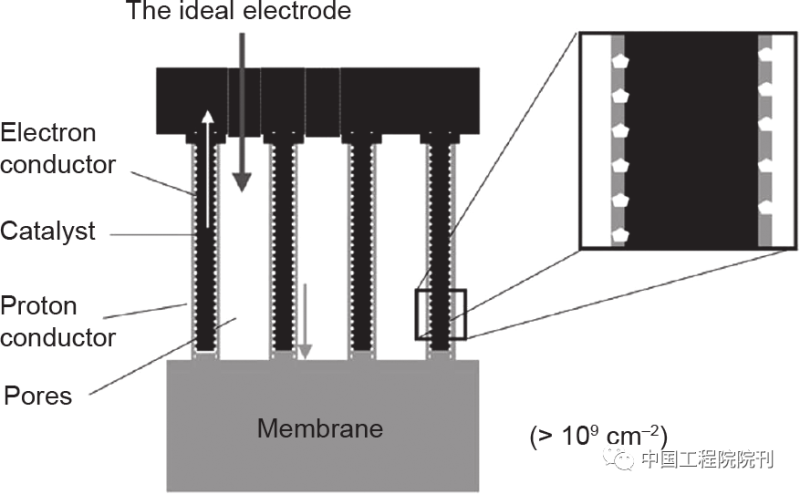針對Pt/C納米顆粒電極存在的問題,提出了基于一維催化劑納米結(jié)構(gòu)陣列的三維有序電極的概念,其目的是在超薄催化劑層內(nèi)大幅度改善有效的傳質(zhì)路徑以提高活性位點的利用率。Middelman提出了基于附載有催化劑的垂直定向的電子導(dǎo)體和質(zhì)子導(dǎo)體,并具有通孔結(jié)構(gòu)的三維有序電極結(jié)構(gòu)的理想模型,如圖3所示。這種獨特的電極結(jié)構(gòu)被認(rèn)為是能夠顯著提高催化劑利用率和功率特性的最有利途徑。近幾十年來,陸續(xù)出現(xiàn)了基于一維納米結(jié)構(gòu)陣列的各種電極類型,比如Pt催化劑修飾的垂直排列的納米線或納米管,以及獨立一維鉑基納米結(jié)構(gòu)催化劑陣列。其中的一些發(fā)現(xiàn),包括我們對鉑納米線陣列電極的研究,在最近一些催化劑材料開發(fā)的綜述中也都有提及。與這些綜述文章不同的是,本文提供了一個基于三維電極結(jié)構(gòu)設(shè)計的系統(tǒng)性評述,在理解這種電極結(jié)構(gòu)的發(fā)展演化和所取得的進(jìn)步的基礎(chǔ)上,探討其對PEMFC發(fā)展所具有的潛在貢獻(xiàn)。