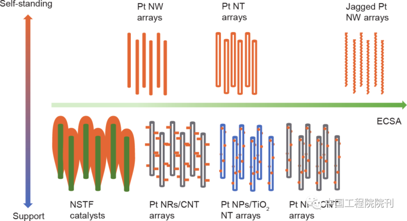 在最近的研究進(jìn)展中,三維有序結(jié)構(gòu)電極,尤其是基于一維催化劑納米結(jié)構(gòu)陣列的電極結(jié)構(gòu)受到了極大的關(guān)注。這種電極結(jié)構(gòu)在降低傳質(zhì)阻力和提高催化劑利用率方面具有獨特的優(yōu)勢,在開發(fā)低催化劑負(fù)載量和大電流密度運(yùn)行的燃料電池方面表現(xiàn)出了巨大的潛力。按催化劑及其載體的結(jié)構(gòu)以及電化學(xué)表面積(ECSA)對這些三維有序結(jié)構(gòu)電極進(jìn)行分類,它們的基本設(shè)計如圖2所示?;阡忼X狀鉑納米線的大電化學(xué)表面積和優(yōu)異催化活性,由其組成陣列的三維有序結(jié)構(gòu)電極盡管目前還沒有報道,但在超高功率密度運(yùn)行方面極具潛力。