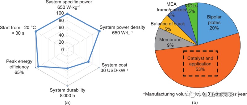 圖1 當(dāng)前PEMFC的發(fā)展?fàn)顩r(a)和電堆的成本構(gòu)成(b)(基于美國能源部2019年氫能和燃料電池項目的年度評估報告)。GDL:氣體擴(kuò)散層;MEA:膜電極。經(jīng)Papageorgopoulos許可,轉(zhuǎn)載自參考文獻(xiàn)