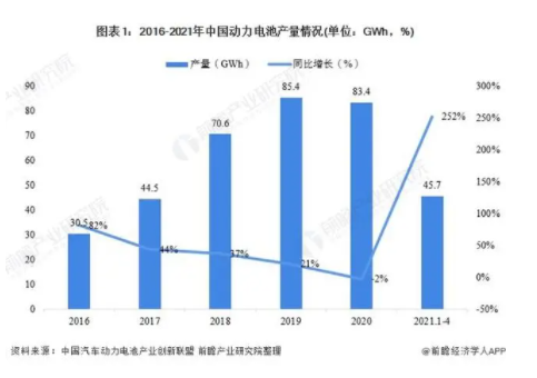 從產(chǎn)量看,據(jù)中國汽車動(dòng)力電池產(chǎn)業(yè)創(chuàng)新聯(lián)盟統(tǒng)計(jì)數(shù)據(jù),2016-2019年,我國動(dòng)力電池產(chǎn)量持續(xù)增長,2020年我國動(dòng)力電池產(chǎn)量較2019年減少2%。2021年1-4月,我國動(dòng)力電池產(chǎn)量恢復(fù)增長,累計(jì)產(chǎn)量為45.7GWh,同比增長252%。