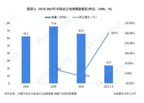 2020年,我國動(dòng)力電池銷量也有所下降,較2019年減少13%。2021年1-3月,我國動(dòng)力電池銷量恢復(fù)增長,銷量累計(jì)達(dá)23.9GWh,同比增長201%。