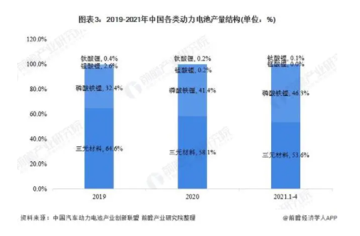從各類材料的動(dòng)力電池產(chǎn)量來看,三元電池是我國產(chǎn)量最多的電池類型,但三元電池占比在逐漸減小。2019-2021年4月,我國三元電池占比從64.6%降至53.6%;而磷酸鐵鋰電池占比在逐漸增大,從32.4%增至46.3%。