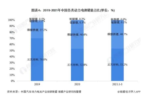 從銷量占比來看,2019-2021年3月,我國磷酸鐵鋰電池的銷量占比在逐步擴(kuò)大,從27.2%增至46.7%。
