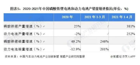 從產(chǎn)銷量增速來看,磷酸鐵鋰電池產(chǎn)銷量增速高于行業(yè)整體增速水平。2020年,全國動(dòng)力電池產(chǎn)銷量均有所下降,但磷酸鐵鋰電池產(chǎn)銷量卻有所增長;2021年1-4月,磷酸鐵鋰電池產(chǎn)量達(dá)21.2GWh,同比累計(jì)增長381%;2021年1-3月,我國磷酸鐵鋰電池累計(jì)銷售11.1GWh,同比累計(jì)增長246%。