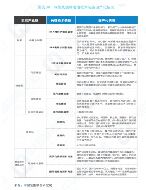 如電解水制氫中的ALK電解水制氫裝備,我國已實現(xiàn)國產(chǎn)化率95%,但氫氣閥門與儀表仍要進口。國產(chǎn)化的核心電解槽部件中,隔膜和電極技術水平與國外仍有差距。