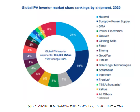 2020年,華為在全球的市場份額相對穩(wěn)定,保持在23%左右。陽光電源的市場占比則提高到了19%。SMA的市場份額從2019年的8%略微下降到了2020年的7%,但仍舊以較大優(yōu)勢排在第三位。