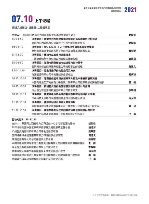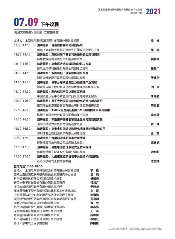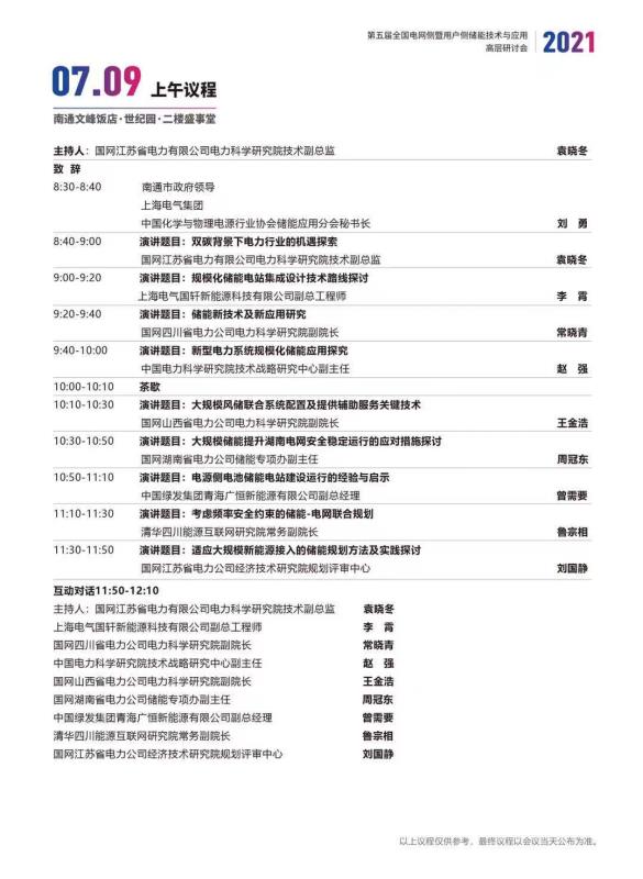 中國儲能網(wǎng)訊:為進一步探討在電網(wǎng)側(cè)及用戶側(cè)建設(shè)儲能電站,緩解高峰負荷對電網(wǎng)的沖擊,同時探索平滑新能源和調(diào)頻輔助服務(wù)等應(yīng)用模式,提升項目運行經(jīng)濟性,中國化學與物理電源行業(yè)協(xié)會儲能應(yīng)用分會決定聯(lián)合江蘇省電機工程學會、中國能源建設(shè)集團江蘇省電力設(shè)計院有限公司等單位于2021年7月9—10日在江蘇省南通市文峰酒店召開“第五屆全國電網(wǎng)側(cè)暨用戶側(cè)儲能技術(shù)應(yīng)用高層研討會”,具體議程如下(最終議程以活動當天發(fā)布為準):