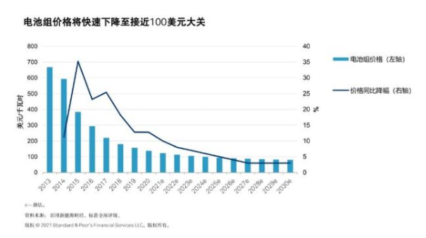 標(biāo)普全球評級預(yù)計鋰電池組的價格最早可在2024年降至每千瓦時100美元。業(yè)內(nèi)人士表示,這一水平將成為電動汽車大規(guī)模普及的拐點。這將使電動汽車與等效內(nèi)燃機汽車一樣便宜。