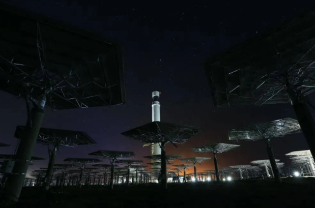 吸熱塔中的熔鹽吸收熱量,將約300℃的熔鹽加熱成560℃的高溫熔鹽,再經(jīng)過熱能交換產(chǎn)生高溫高壓蒸汽,推動汽輪發(fā)電機發(fā)電。整個項目配置了13小時儲熱系統(tǒng),能夠確保機組24小時連續(xù)、穩(wěn)定地運行。同時由于采用熔鹽作為儲熱介質(zhì),可以滿足電網(wǎng)需要,隨時進行負荷調(diào)整。相比傳統(tǒng)發(fā)電,光熱發(fā)電最大優(yōu)勢是能夠?qū)崮軆Υ?,熔鹽的余溫可以在夜間繼續(xù)推動發(fā)電,實現(xiàn)24小時持續(xù)發(fā)電,就像“蓄電池”,白天充電,晚上放電,同時也不受云層干擾。