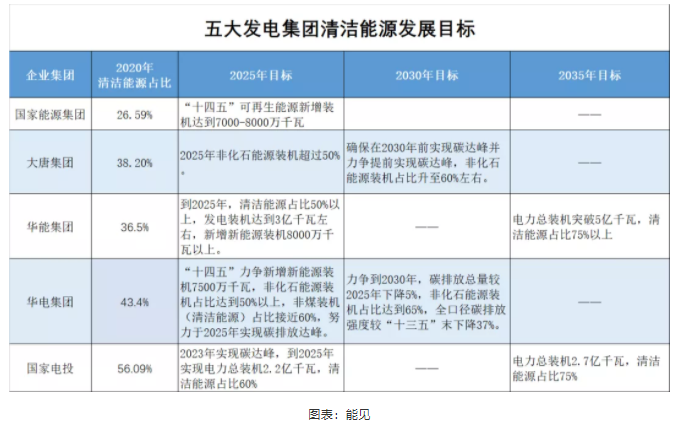 從2025年“十四五”目標(biāo)看,非化石能源裝機(jī)占比達(dá)到50%以上,在五大發(fā)電集團(tuán)中同樣是一個(gè)較高的目標(biāo),算上天然氣,清潔能源裝機(jī)占比同樣遠(yuǎn)超50%,可能與此前口徑一致保持在接近60%。