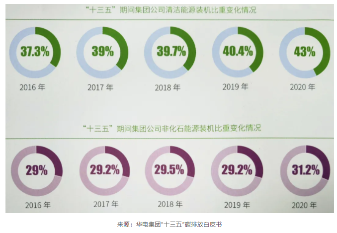 華電集團(tuán)提出這一目標(biāo),得益于其過(guò)去在清潔能源方面的重視和投入。其非化石能源裝機(jī)占比由“十二五”末的28.6%提高到了2020年底的31.2%,清潔能源裝機(jī)占比由“十二五”末的37%提高到了2020年底的43%.