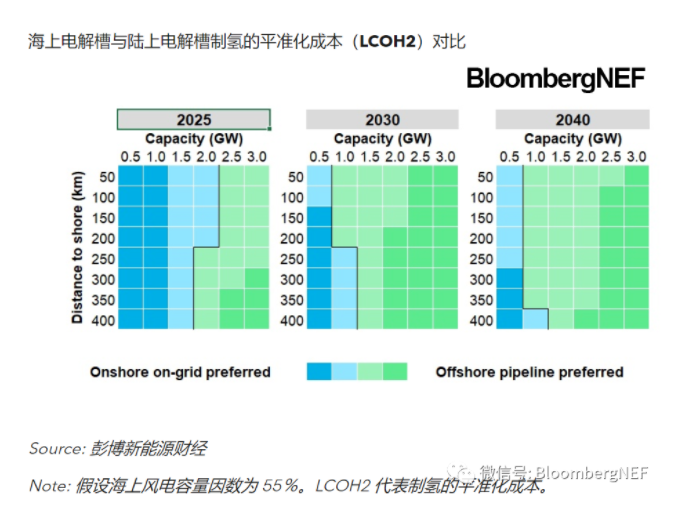 海上電解槽制氫項目的成本通常高于陸上電解槽制氫,但將在2030年迎來拐點。對于離岸距離較遠(yuǎn)的GW級大型項目,直接在海上部署電解槽制氫并通過海底管道將生產(chǎn)的氫氣輸送回陸地是更合適的選擇。