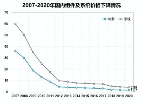 中國光伏組件、系統(tǒng)(建設(shè))成本降低情況