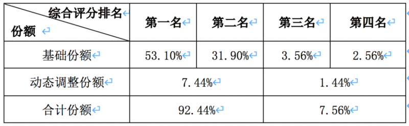 中標人數(shù)量原則上為4個,由綜合評分排名前4的中標候選人中標,中標份額占比為數(shù)量份額占比,具體份額分配方案為: