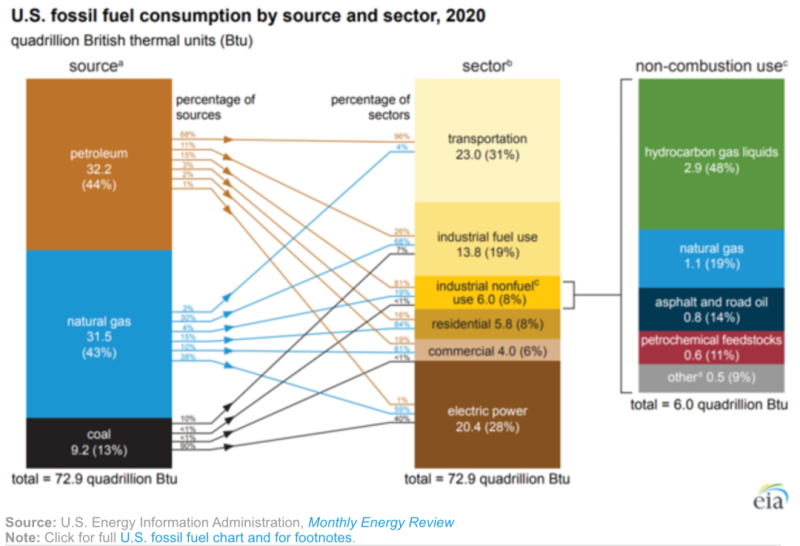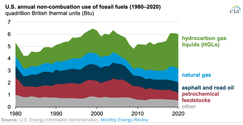2020年,化石燃料的非燃料使用量約占美國化石燃料消耗量的8%,直接用作建筑材料、化工原料、潤滑劑、溶劑和制蠟。