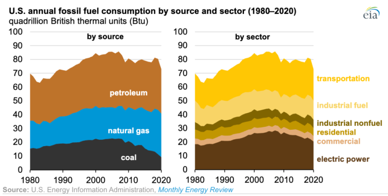 這是自1949年以來美國化石燃料消耗量以絕對值和百分比計算的最大年度下降,主要是受到2020年COVID-19疫情的影響,美國運(yùn)輸業(yè)能源消耗減少了15%。美國2020年冬天整體相對溫和,減少了對取暖燃料的需求。