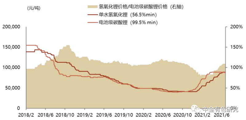 海外高鎳三元需求加速增長,氫氧化鋰上行邏輯強(qiáng)化。一是受益政策刺激和疫情復(fù)蘇,歐美新能源車市場(chǎng)明顯提速,以高鎳三元為主的海外需求將顯著拉動(dòng)氫鋰的需求。二是除少數(shù)龍頭外,多數(shù)氫氧化鋰廠商缺少穩(wěn)定的長協(xié)原料保障以及足夠鋰礦庫存,或?qū)⑹茉牧现萍s被動(dòng)降低開工率。三是截至2021年6月25日,氫鋰相對(duì)電碳的溢價(jià)率僅9%,不足以體現(xiàn)氫氧化鋰更高的工藝壁壘和質(zhì)量要求。我們認(rèn)為,結(jié)構(gòu)性供需抽緊將強(qiáng)化氫氧化鋰上行邏輯,氫氧化鋰主要供應(yīng)商及具備擴(kuò)產(chǎn)預(yù)期和能力的企業(yè)有望實(shí)現(xiàn)量?jī)r(jià)齊升。