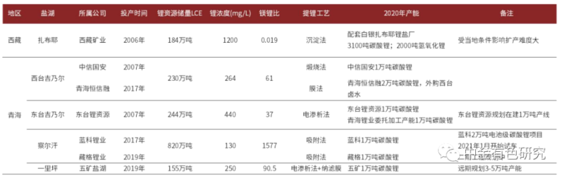 我國鹽湖資源儲(chǔ)量豐富,主要分布于青藏高原。根據(jù)2019年中國礦產(chǎn)資源報(bào)告,我國鹽湖鹵水型鋰資源以氯化鋰計(jì)潛在資源量為9250萬噸(折LCE約8066萬噸),占全國鋰資源量約79%。當(dāng)前主要開發(fā)的鹽湖資源可分為碳酸鹽型和硫酸鹽型,前者以西藏的扎布耶鹽湖為代表,后者以青海的察爾汗鹽湖、西臺(tái)吉乃爾鹽湖等為代表。