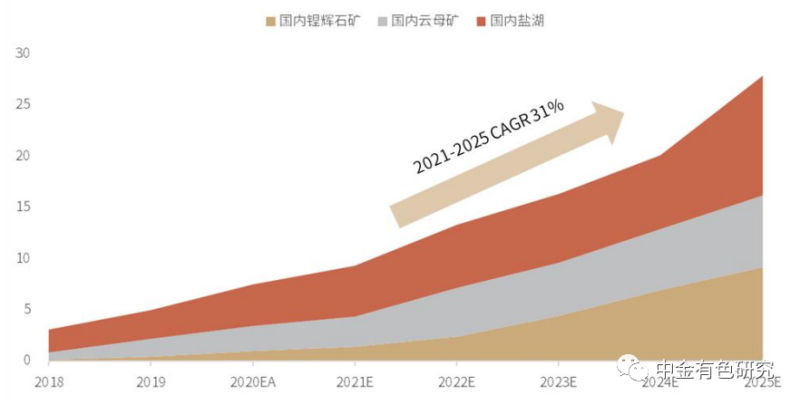 國內(nèi)鋰資源開發(fā)有望加速。國內(nèi)鋰資源雖儲(chǔ)量豐厚,但其資源稟賦并不出色,且受當(dāng)?shù)囟喾N因素制約,長期以來開發(fā)程度較低,僅作為供給側(cè)補(bǔ)充。在上輪鋰價(jià)下行期,國內(nèi)鋰礦及鹽湖產(chǎn)能逆周期擴(kuò)張,且生產(chǎn)工藝持續(xù)進(jìn)化,當(dāng)前國內(nèi)鋰資源保障已經(jīng)提升到戰(zhàn)略高度,國內(nèi)優(yōu)質(zhì)鋰礦以及鹽湖資源的開發(fā)進(jìn)程有望加速,我們預(yù)計(jì)國內(nèi)鋰資源供給將從2021年的10.0萬噸LCE增長至2025年的29.8萬噸LCE,2021-2025年CAGR為31%。