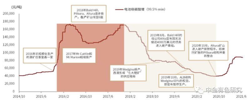 經(jīng)歷上輪鋰價(jià)下行周期,澳洲在產(chǎn)澳礦僅余四家。2016年前在產(chǎn)澳礦僅泰利森一家,2017年開始隨著新礦山的相繼投產(chǎn),澳洲逐步形成七大鋰礦格局。2018-2020年鋰精礦價(jià)格從高位經(jīng)歷了長達(dá)兩年的單邊下行,至2020年下半年鋰精礦價(jià)格下探到390美元/噸的歷史低點(diǎn),低于除泰里森外主要在產(chǎn)澳礦的現(xiàn)金成本,澳礦企業(yè)隨之逐步出清,Wodgnia被收購后即雪藏,Bald Hill與Alura相繼破產(chǎn),至目前僅余四家在產(chǎn)澳礦。