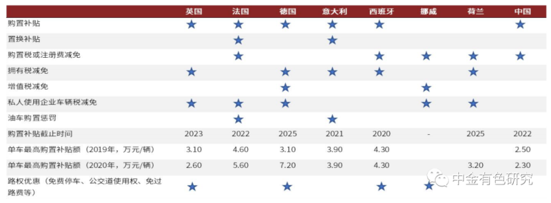 歐洲各國以高補(bǔ)貼政策刺激新能源汽車消費(fèi)。歐洲各國對(duì)新能源汽車實(shí)施稅收減免等補(bǔ)貼以刺激新能源汽車消費(fèi),具體在購置補(bǔ)貼、登記稅、所有稅和公司用車稅上均有減免政策。在歐盟碳排放標(biāo)準(zhǔn)日益趨嚴(yán)的壓力下,各國或因難以達(dá)到補(bǔ)貼標(biāo)準(zhǔn)而延遲補(bǔ)貼退出,甚至進(jìn)一步增加補(bǔ)貼力度。以德國為例,2020年10月德國新車排放量為131.4g/km,距離歐盟95g/km的標(biāo)準(zhǔn)有一定差距,因此政府將撥款10億元,并將購買新能源汽車的消費(fèi)者的補(bǔ)貼延長到2025年。