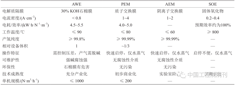 在技術(shù)層面,電解水制氫主要分為AWE、PEM水電解,固體聚合物陰離子交換膜(AEM)水電解、固體氧化物(SOE)水電解,相關(guān)特性對(duì)比見(jiàn)表1。