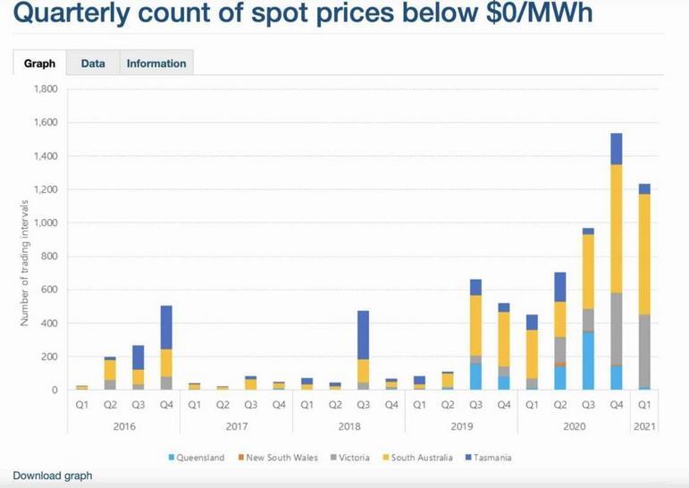 關(guān)鍵指標(biāo)之一是負(fù)定價(jià)事件的數(shù)量。這種情況過(guò)去只發(fā)生在燃煤發(fā)電商競(jìng)爭(zhēng)激烈的時(shí)候。而這種情況現(xiàn)在成倍增加,尤其是在白天,并且由于太陽(yáng)能發(fā)電或風(fēng)力發(fā)電量有時(shí)過(guò)多,或者電網(wǎng)限制了與其他州共享電力輸出的機(jī)會(huì)。