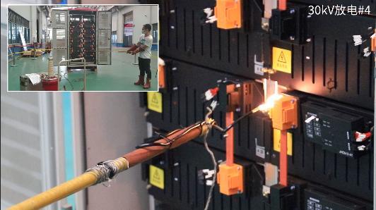 大家看圖片上,試驗(yàn)人員通過高壓放電槍對(duì)電池簇其中一個(gè)點(diǎn)在靠近做接地放電試驗(yàn),放電點(diǎn)產(chǎn)生放電弧光,持續(xù)過程中,電池沒有發(fā)生漏液,冒煙,起火,爆炸等任何現(xiàn)象。