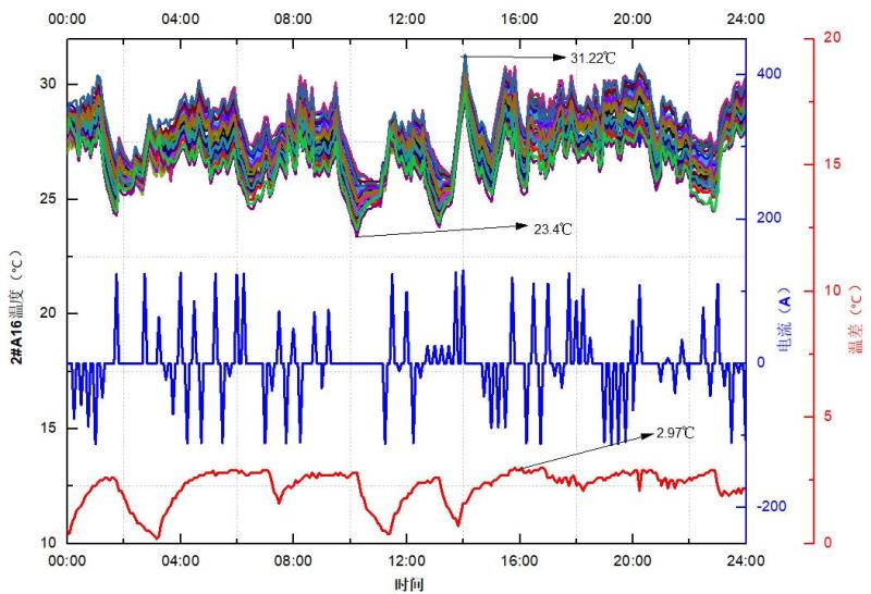 最上面的曲線,是整簇所有溫度測(cè)點(diǎn)的曲線疊加,中間藍(lán)顏色的是當(dāng)前電池簇運(yùn)行的直流電流,電流大的時(shí)候溫度往上走,沒有電流的時(shí)候溫度往下走。最下面的紅色曲線是本簇電芯溫度的最高溫度與最低溫度的差值曲線,溫度差最高值控制在2.97℃。也就是說:本簇所有電芯溫度,電芯之間最大溫差在3℃范圍內(nèi)。