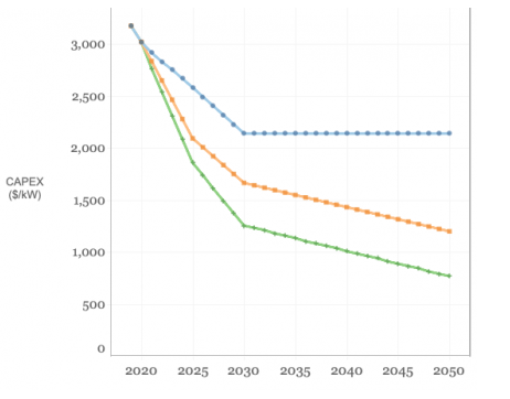 在分析了市場趨勢、政策動(dòng)態(tài)以及研發(fā)成本情況之后,在保守(藍(lán)色曲線)、適度(橙色曲線)和先進(jìn)(綠色曲線)發(fā)展的情景下,持續(xù)放電時(shí)間為10小時(shí)的公用事業(yè)規(guī)模電池儲(chǔ)能系統(tǒng)的資本支出減少曲線