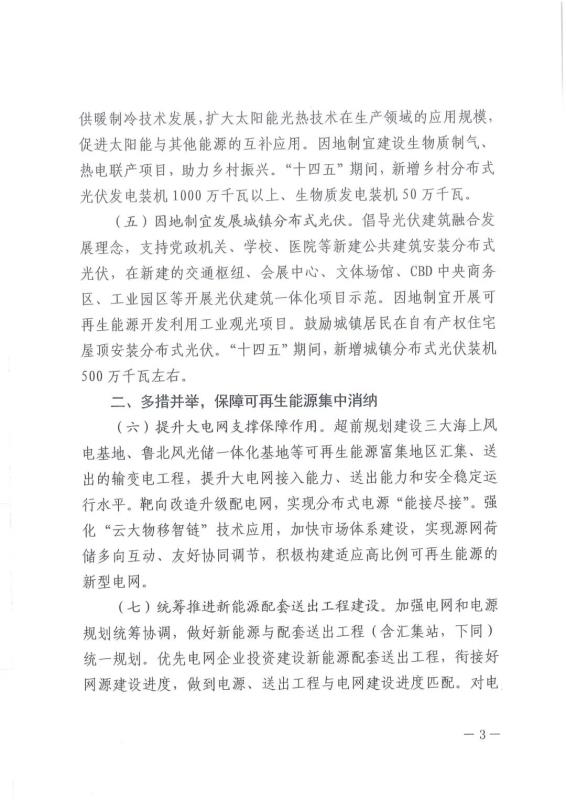 具體包括:到2025年,(風(fēng))光儲一體化基地在建在運(yùn)裝機(jī)容量達(dá)到2000萬千瓦左右;“十四五”期間,新增分布式光伏裝機(jī)量1500萬千瓦以上,其中鄉(xiāng)村分布式光伏發(fā)電裝機(jī)1000萬千瓦以上、生物質(zhì)發(fā)電裝機(jī)50萬千瓦,新增城鎮(zhèn)分布式光伏裝機(jī)500萬千瓦左右。