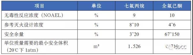 注:1. 安全余量 =(無毒性反應(yīng)濃度 - 參考滅火設(shè)計濃度)/ 參考滅火設(shè)計濃度
