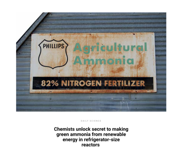 100年前,氨幫助農(nóng)業(yè)革命,并為世界上日益增長(zhǎng)的人口提供了糧食。氨是肥料的主要成分,當(dāng)今世界糧食生產(chǎn)的一半都依賴氨。但是,氨卻有著巨大的碳足跡,生產(chǎn)一公噸氨導(dǎo)致兩倍的二氧化碳排放。